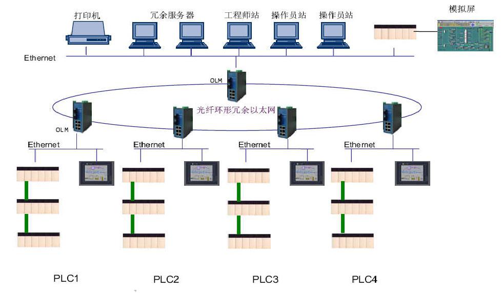 Ø 凭证以上特点,,,,,,本系统选用西门子 S-300 系列的中小型 PLC 对各工艺段或装备疏散控制,,,,,,通过以太网组成网络,,,,,,各工艺段控制室和中控室设置上位机,,,,,,构建人机界面举行生产治理和对生产数据举行后续处置惩罚。。。。。全厂控制网络如系统结构图所示。。。。。