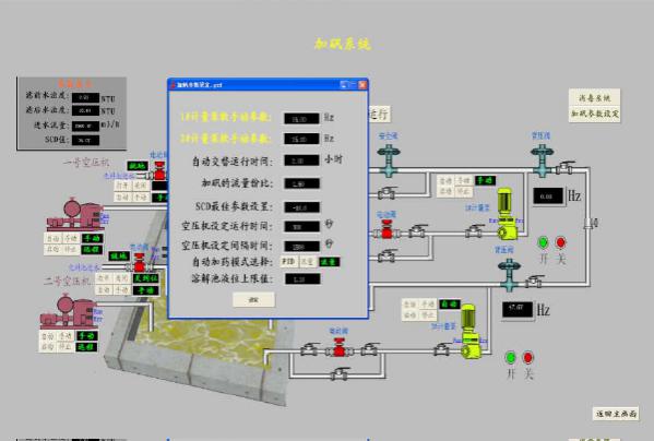 该系统人机界面由若干个画面组成:总画面(水厂水处置惩罚工艺)、各系统工艺图、报表窗口、报警窗口等。。。。。为增添画面的可读性和可鉴赏性,,,,,,主要画面均接纳平面图形式,,,,,,在画面的相关位置显示该装备的所有主要运行参数。。。。。装备的控制通过点击该装备进入,,,,,,